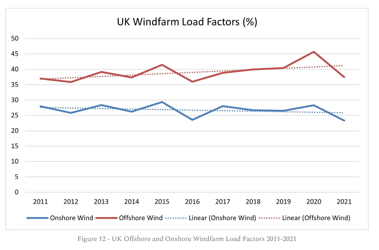 Second, let us look at wind power. There’s been a lot of talk about improving load factors by using larger turbines and the Government have assumed significant increases in load factors in their estimates of future costs of wind power. However, the Government figures (Table ET6.1) on actual achieved load factors show only a small increase in offshore wind, which is still below their forecast levels and an actual decrease in onshore wind load factors, see Figure 12. These improvements are not going to make a material difference to EROEI, land use or mineral usage.