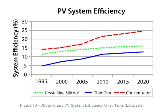 Now on to solar power. It is true that the efficiency of solar panels has increased over time and Weissbach’s EROI calculations were made about a decade ago. The EROEI metric might be expected to have improved since 2013. However, Lafayette have compiled a chart (see Figure 13) from NREL data that shows the improvements in module efficiency for crystalline silicon PV panels have not been particularly great since 2010, and appear to be close to topping out.