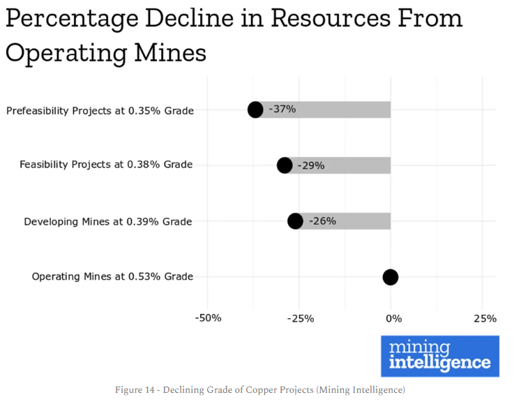 Moreover, as Figure 14 shows, taken from Mining Intelligence, the grade of new discoveries of critical materials like copper is declining.