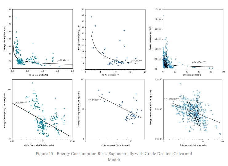 As ore grades decline, the energy required to extract the required material rises exponentially (see Figure 15) as this paper by Calvo and Mudd explains.