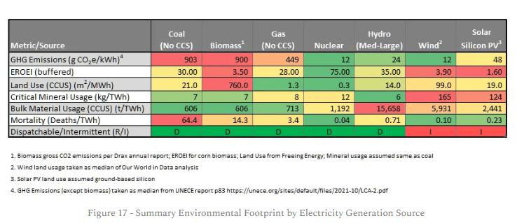 However, we need to look at broader measures when assessing the sustainability and the green credentials of generation technologies. The results of the above analysis are summarised in Figure 17 below. Biomass, wind and solar perform very badly compared to the alternatives.
