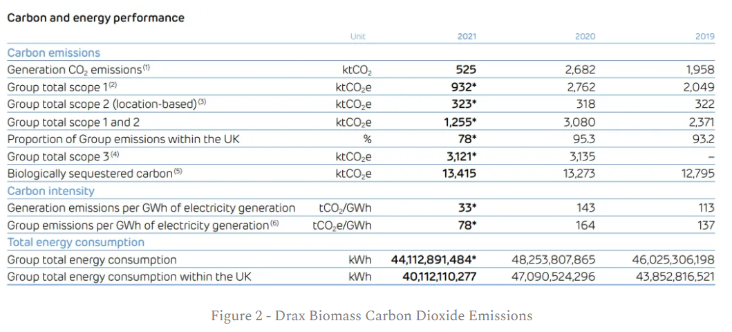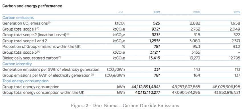 Despite Drax being the biggest single CO2 emitter in the country, they manage to get away with calling this “green” energy by pretending that the CO2 emitted from burning trees doesn’t exist. Figure 2 below shows an excerpt from their annual report on carbon emissions.