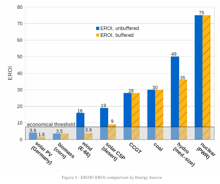 As can be seen nuclear and hydro come out top with EROI of 75 and 35 (buffered) respectively. Gas and coal fare well on this metric with similar ratings of 28 to 30. Concentrated solar power in the desert with a buffered EROI of 9 just about makes it above the economic threshold. However, corn biomass and buffered wind and solar fall well below the requirement with EROIs of 3.5, 3.9 and 1.6 respectively.