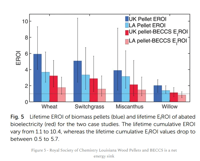 The Royal Society of Chemistry has conducted an analysis of biomass EROI and in particular the EROI of bioenergy with carbon capture and storage (BECCS). They come up with a range of <2 for North American biomass pellets used to produce electricity. This is lower than the Weissbach analysis. However, they assess that BECCS could have an EROI of less than 1 and be a threat to energy security (see Figure 5, from their Figure 5).