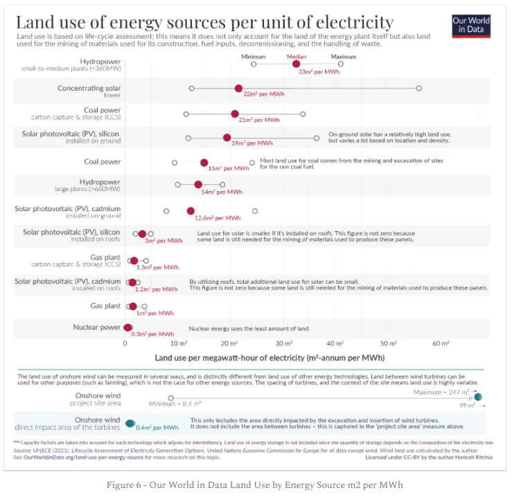 Our World in Data have produced a helpful chart using data from UNECE (2021) to compare the land use of the main energy sources (see Figure 6), excluding biomass.