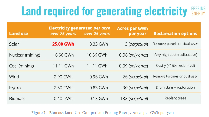 They use a different methodology and different units. They come up with 3 acres/GWh for solar and 0.06 acres/GWh for nuclear. This translates to 12m2/MWh for solar and 0.24m2/MWh for nuclear. Both are slightly lower than the Our World in Data figures for nuclear and silicon PV ground installations, but in a similar ballpark. Converting their 188 acres/GWh for biomass gives a result of 760m2/MWh which is close to an order of magnitude larger than the median value for wind. So, despite the differences in methodology, we can safely say, biomass fares very poorly on land use calculations, because of the thousands of acres of trees that need to be cut down.