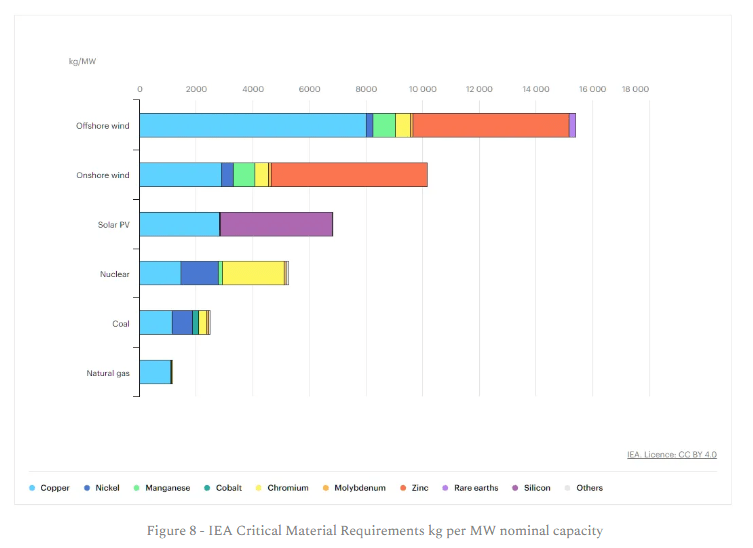 Bright New World have looked at bulk material use by energy source and the results are shown in Figure 10 below. For the purposes of this analysis, I have excluded copper because copper is included in the critical minerals analysis above.