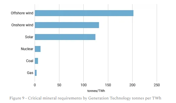 Wind and solar require 10-300 times more space than nuclear or gas and more than hydro. They also require 10-20 times more critical minerals per unit of electricity than all other sources of electricity generation and several times more bulk materials than all other sources except hydropower.