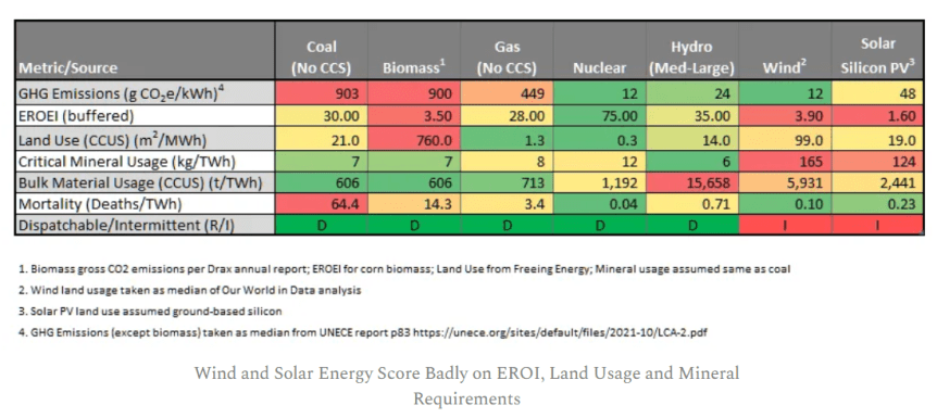 On the energy return on energy invested, wind and solar perform below the economic threshold when the requirement for buffering to cope with their inherent intermittency is taken into account. Biomass also performs below the economic threshold and if the BECCS proposals are carried out actually becomes a net energy sink. On this measure alone wind, solar and biomass should be ruled out for further subsidy or development.