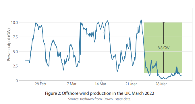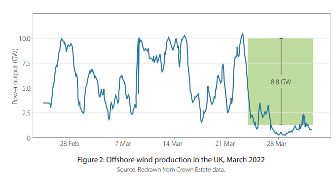 The wind blows somewhat more steadily offshore than onshore, as every sailor knows. Nevertheless, the unreliability inherent in wind energy persists. Figure 2 shows the wind power generated by all UK offshore windfarms in March 2022, as presented online on the Crown Estate website. [4] Over some periods, it rose to the nominal installed capacity of 10GW. However, for 8 days at the end of the month it averaged no more than 1.2GW. The green rectangle (added) illustrates that 8.8GW was not available for this time, presumably because the average wind speed halved. That much energy, 1600GWh, is 1000 times the capacity of the world’s largest grid storage battery (1.6GWh at Moss Landings, California). Battery technology has its own problems. It can provide for laptops and other portable applications, even car batteries at up to 75 kWh, but larger batteries have problems with safety [5] and mineral shortages. [6] Batteries 20 million times larger are never going to be available and storage batteries will never make good the failure of offshore wind farms, even for a week. And the wind can drop for longer periods than that.