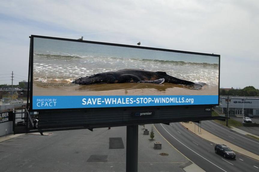 Conservative watchdog groups ran a guerrilla-style ad campaign on the Jersey Shore for Earth Day, drawing attention to a surge in whale deaths amid the growth of offshore wind farms.