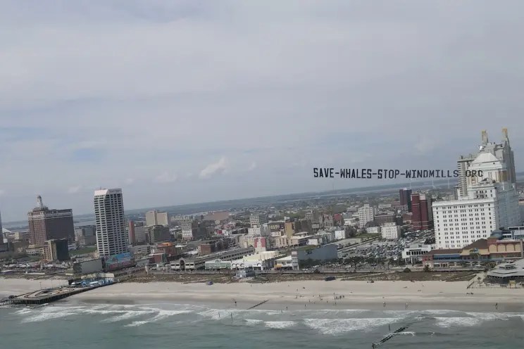 Beachgoers in Atlantic City on Saturday looked on as a single-propeller plane carried a message waving from a banner — “SAVE-WHALES-STOP-WINDMILLS.ORG” — and drivers heading out of town saw a billboard with the same message and a picture of a dead whale washed ashore.