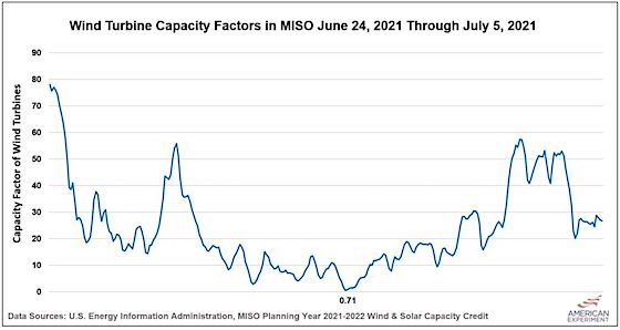 You read that correctly: in the heart of the Summer, over the entire Midcontinent Independent System Operator territory, wind turbines generally produce less than 30% of their rated capacity. Sometimes they produce virtually nothing over the entire region.