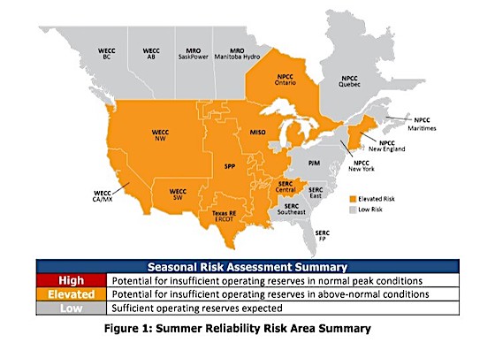 All of the areas of the country appear to have enough reliable power plants online to meet normal summer peak electricity demand, according to the NERC report, but most of the country will “face risks of electricity supply shortfalls during periods of more extreme summer conditions.” The areas at elevated risk are shown in orange on the map below.