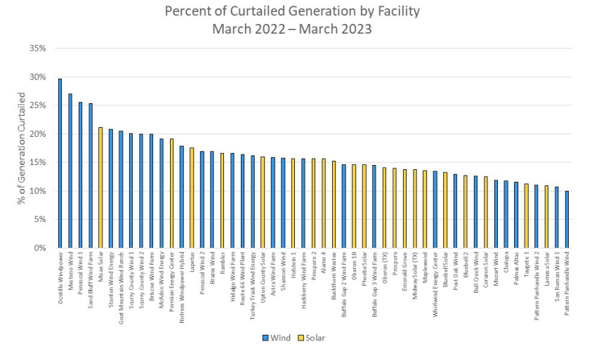 The image below shows the curtailed percentage of annual production curtailed from solar and wind farms in Texas in the last 12 months, ranging from 10 to 30 percent of the total production, and growing year over year.