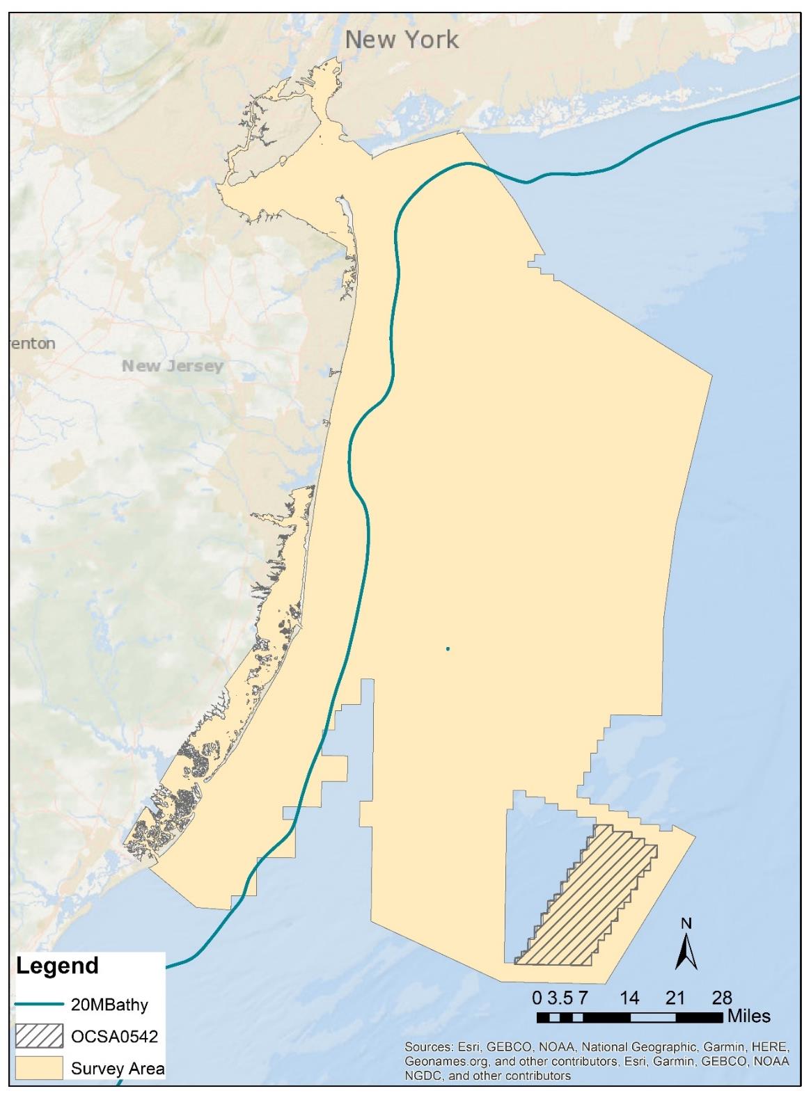 This possible-cable area is enormous. It runs from New York City to south of Atlantic City and from the Jersey Shore to over 50 miles out to sea. The front page of the NMFS proposal linked above has a map, conveniently showing both the tiny site area and the huge ECR area.