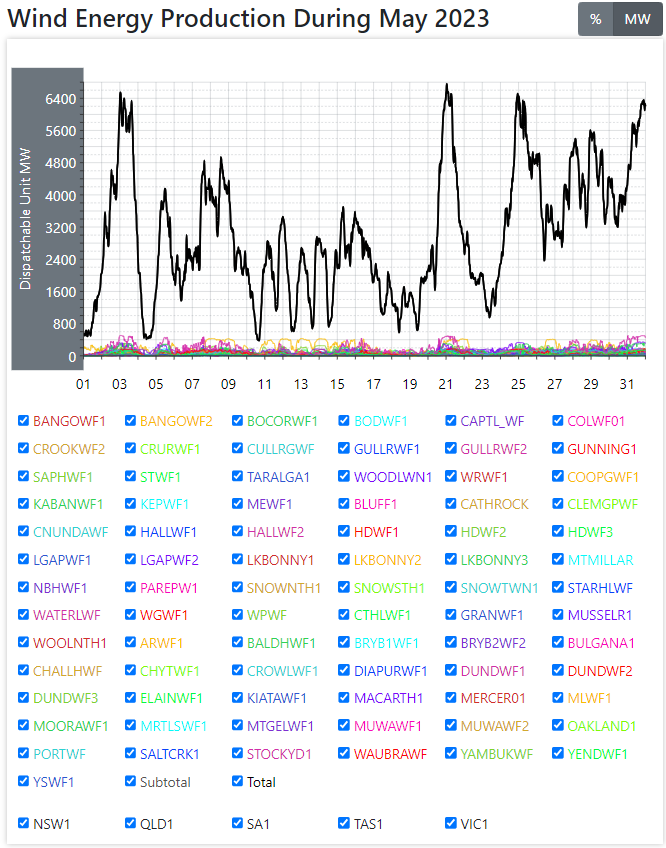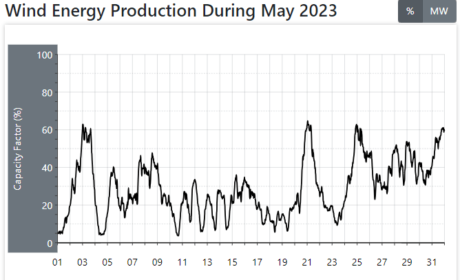 The first graphic below shows the combined output in MWs of every one of those wind farms during May 2023, the second does so in terms of percentages of their combined notional capacity.
