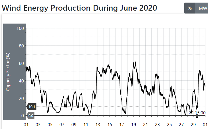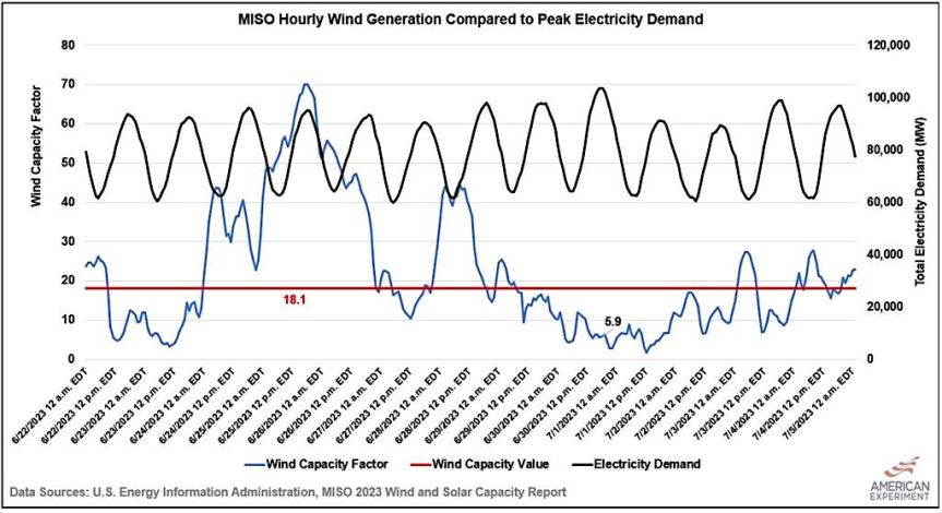 Here in the Upper Midwest, we have experienced a couple of hot weeks, which means that air conditioners have been running. MISO, the Midcontinent Independent System Operator, has a nominal 28,572 megawatts of wind energy on its grid. Surely the wind turbines were able to keep the air conditioners running. Right?