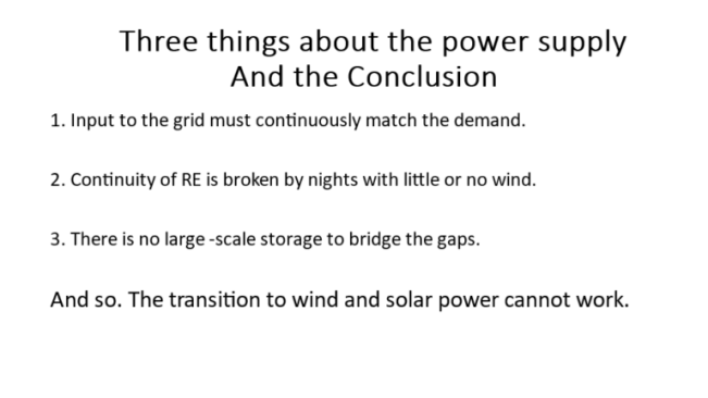 The first thing is to explain the danger of windless nights if we ever have to depend on wind and solar input to meet demand. This danger did not arise as long as we had a large reserve of conventional power capacity.