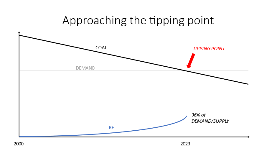 Meanwhile the penetration of wind and solar power rose from zero to reach 36% of demand last month. The expectation is that coal will continue to exit the system and RE will continue to rise.