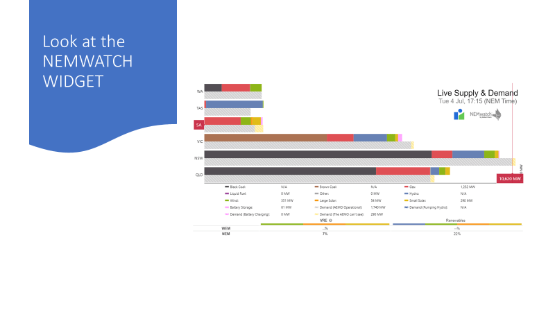 We can easily monitor the wind supply using the NemWatch widget provided by the great RE supporters at Global Roam. They think that we will be impressed by the amount of wind and solar power that you can see using their widget on sunny afternoons when the wind is brisk, especially in South Australia, the wind-leading state.