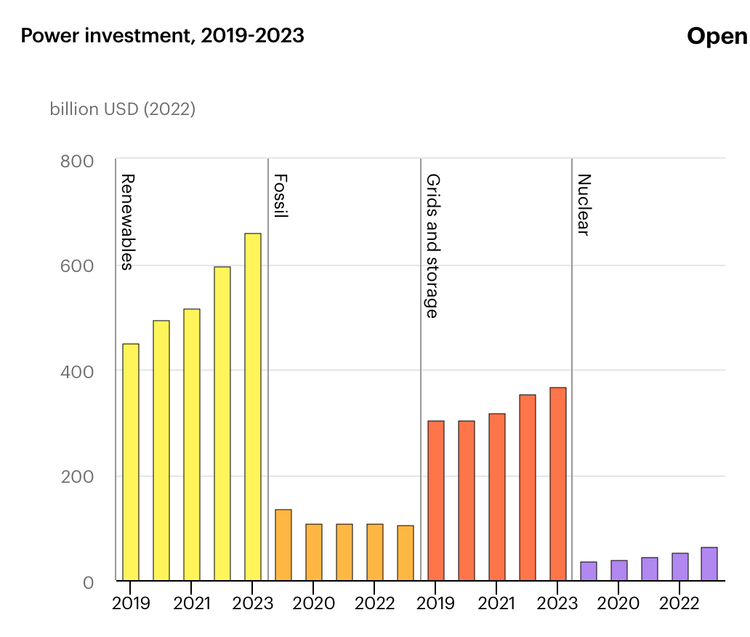 IEA provides the following chart to illustrate how investment in fossil fuels and related infrastructure has shrunk from the majority of world energy investment in 2015, to a rapidly diminishing minority in 2023: