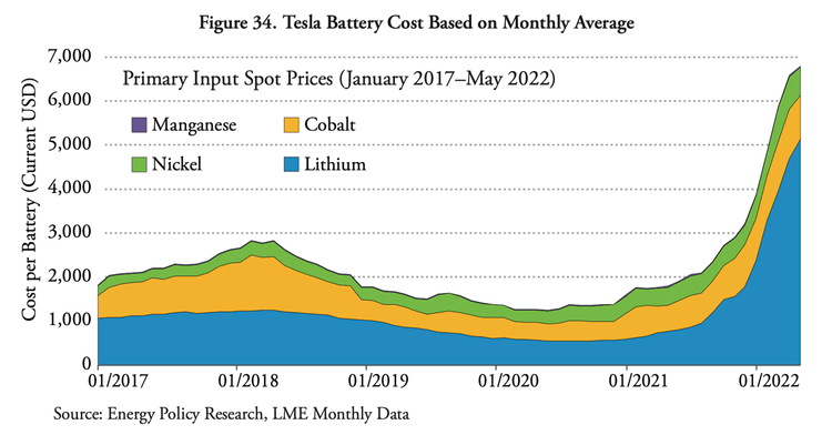 IEA seems to think that electric vehicles will save the world because they have “zero emissions” and their costs will rapidly plunge. Here is a chart from the EPRF Report on costs of the main materials for EV batteries (which are the main component of an EV):