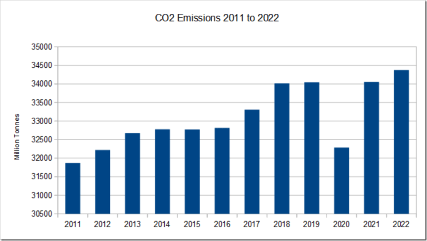 The other chart of interest is CO2 emissions, which have resumed their steady rise following signs of a standstill last year, which as I noted at the time was probably Covid related. They rose 1% from 2021 to 2022, and now stand 5% higher than in 2015 when the Paris Agreement was signed: