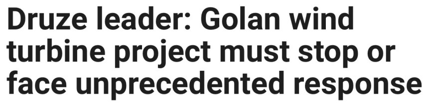 On June 24, The Times of Israel reported that “The head of the Druze community in Israel, Sheikh Muafak Tarif, has warned the government to stop the work to construct wind turbines in the Golan Heights, or face ‘a reaction the country has hitherto not seen.’” The article continued, saying the wind project has: