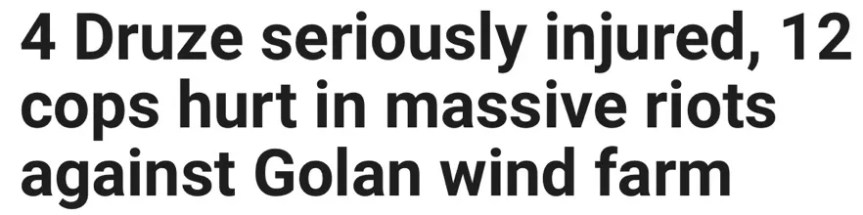 Thousands of Druze residents of the Golan Heights rioted for the second day Wednesday against the construction of a new wind farm near the town of Majdal Shams, burning tires and hurling rocks, fireworks and Molotov cocktails at massive police forces securing the area. The Israel Police urged the public to stay away. Twelve police officers were wounded. Four demonstrators were seriously injured, one of them from gunfire, along with three moderately and one lightly.