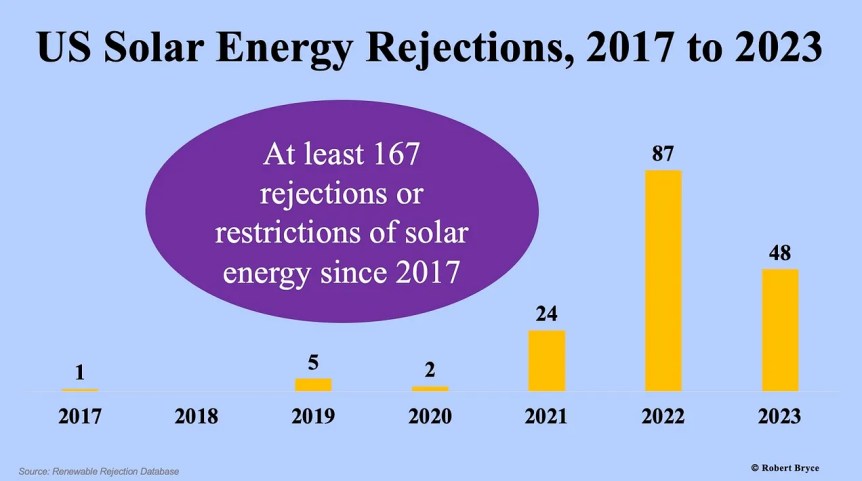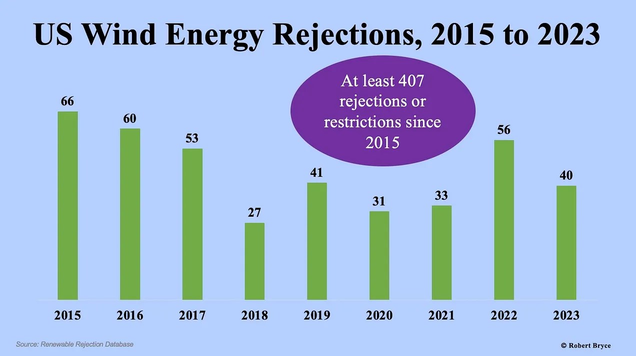 Now back to the U.S., where I have been documenting the backlash since 2015. Over the past few weeks, I have been updating the Renewable Rejection Database, which is the only free, online, searchable database of rejections and restrictions on wind and solar. The latest tallies: 407 wind rejections and 167 solar rejections.