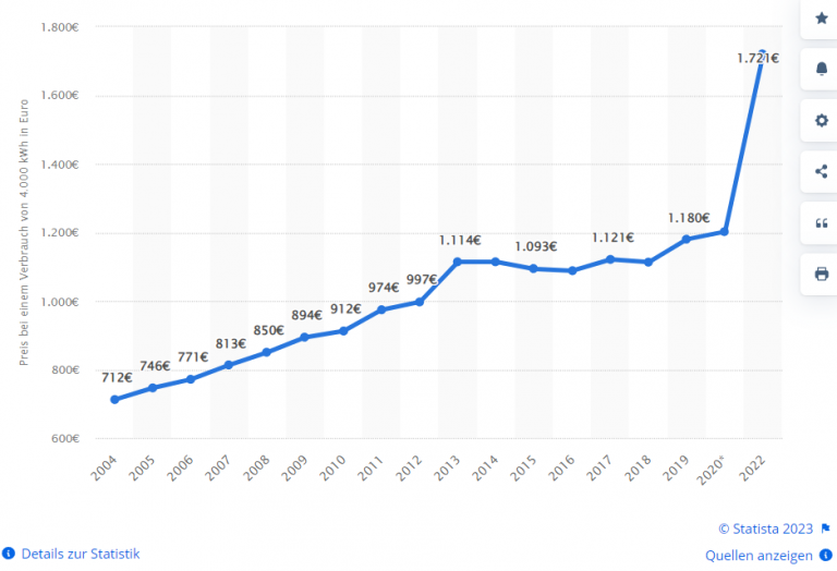 Electricity price for private households in Germany with an electricity consumption of 4,000 kWh in the years 2004 to 2022. Source: Statista. Published by