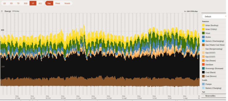 TonyfromOz collected a years’ worth of daily NEM data and analysed it for the contribution from each source for each time interval. This was averaged. Those values went on a graph for a single day closest to the average. The results shown in Figure 9 indicate just how much Australia still relies on fossil fuels, especially in the period 5pm to 7am. Figure 10 is the whole year’s data (plotted as daily totals) he analysed showing the still very high reliance on coal.