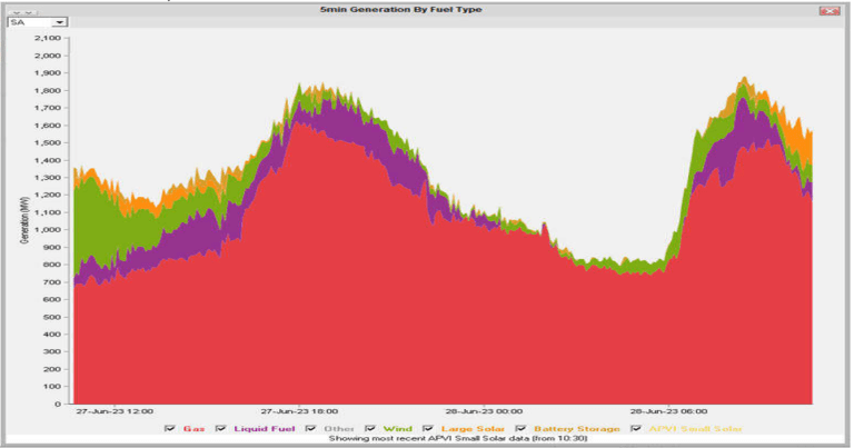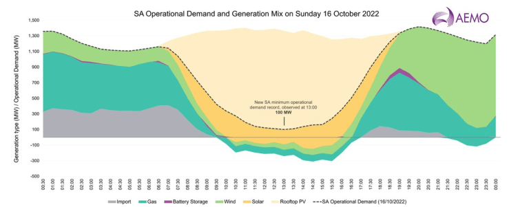 Fig 2 SA demand showing midday canyon in grid demand but gas kept on and very high gas and interconnector contributions morning and evening. Very little from batteries, especially in morning.