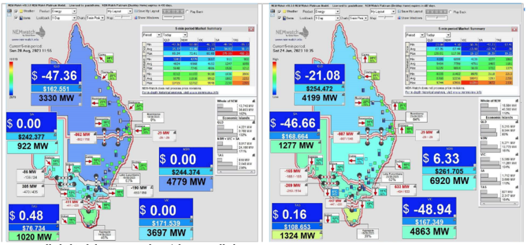 A common issue occurring on the electricity spot market now, especially over the summer, is low or even negative pricing. This is in the period 10am to around 4pm. Examples are shown in Figure 5. During these periods, the wind and grid solar can be constrained off but like Figure 2 shows, the gas turbines (GTs) continue to run in SA. As all the coal-fired stations need to stay on, albeit at reduced load and lower efficiency, both to ramp up when the sun goes down and provide inertia/ system support. The coal stations operate at a loss during these times unless they have long term contracts for the power.