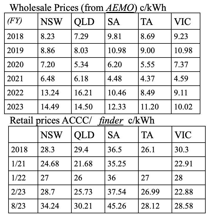 What the actual price component breakdown is now, does not seem to be available. Even what is published may be distorted by subsidies and Feed-In Tariffs for those with domestic solar. However, by trawling through various documents on Wayback, what is shown in the tables below is the wholesale and domestic prices for the 5 states in NEM. Most of the electricity generated is not sold through the wholesale spot market but on longer-term contracts.
