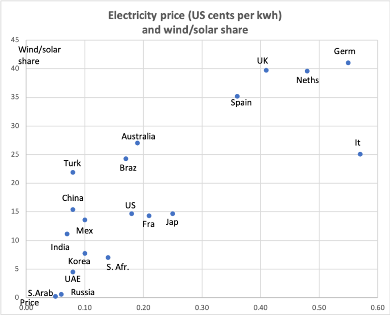 The readily available data by country for the wind and solar renewables share and price of electricity show a high share of renewables is concomitant with high electricity costs. The cheapest electricity is found in the nations with the lowest renewable energy share: Saudi Arabia, Russia, India, UAE and Korea. Germany, the UK, the Netherlands, Spain and Italy have high prices and high renewables shares.