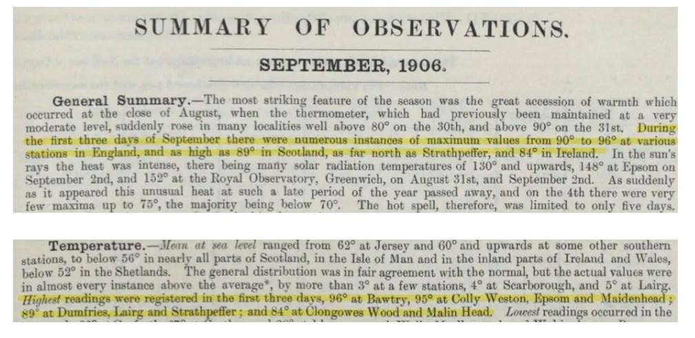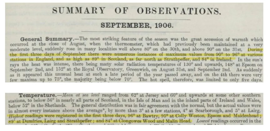 It was much hotter in September 1906, when the temperature reached 96F at Bawtry in South Yorkshire, still a UK record for the month. That heatwave lasted five days from August 30 to September 3, and covered the whole country, from Scotland and Ireland to the south of England.