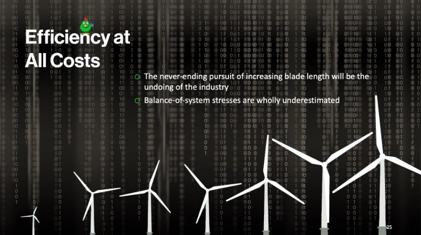 During our July Doom Zoom presentation—Doom Scrolling: Searching the Globe for Things to Worry About—we made the case that the wind sector might be teetering on the verge of collapse. We argued that the never-ending pursuit of longer blade lengths would be the industry’s undoing, that the resulting balance-of-system stresses were being wholly underestimated, and that the existing fleet of turbines in the field are stationary point-sources of future liability for those who installed them. We repeated our claim that levelized cost of electricity (LCOE) estimates were tantamount to fraud, and that the veil would soon be lifted, causing significant disruption to the entire wind value chain.