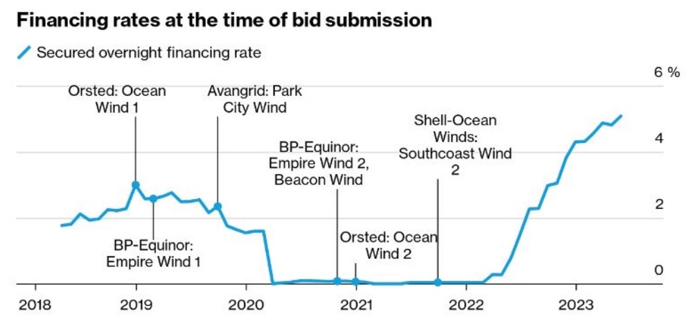 Turns out that spearing these things into the ocean floor, miles offshore, and connecting them to return the power they occasionally deliver to market was always more expensive than the promoters let on. Now, the rapidly increasing cost of the materials required, coupled with the surge in interest rates, have caused investors to run to the hills. Once grand-sounding projects have been scrapped, and the smart money is looking for something else to invest in.