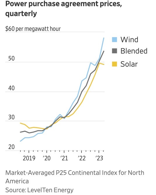In June, the International Energy Agency reported that the cost of large-scale solar and wind power jumped by about 20% last year. As seen in the graphic above, LevelTen Energy recently found that the agreed price on power purchase agreements for wind and solar projects more than doubled between 2020 and the second quarter of 2023. Last month, the British government got no bids for new offshore wind projects. According to the BBC, the government blamed a “global rise” in inflation impacting supply chains had “presented challenges for projects.”