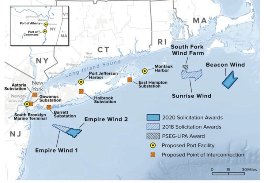 The developers of four offshore wind farms in New York are seeking average price rises of almost 50% on their offtake agreements. . . . The projects involved are Orsted and Eversource’s 924MW Sunrise Wind project, along with Equinor and bp’s 816MW Empire Wind 1, 1260MW Empire Wind 2 and 1230MW Beacon Wind. Sunrise Wind previously agreed a price of $110.37 per MWh, and is now seeking a $139.99 price instead, a 27% increase, according to NYSERDA. Empire Wind 1 requested increasing its strike price from $118.38 to $159.64, a 35% increase, while Empire Wind 2 asked for its $107.50 original price to be increased to $177.84, a 66% increase. Meanwhile, Beacon Wind wants its $118.00 previously agreed price ramped up to $190.82, 62% more. The three Equinor and bp projects combined have an average price rise of 55%.