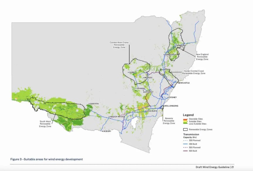 The NSW government has blotted out nearly the entire state as “less suitable” for wind farms, with few if any areas deemed “desirable” for new projects under new draft planning guidelines issued on Tuesday.