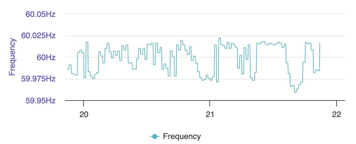 To this day, the critical factor underlying the integrity of electricity grids is maintaining a frequency of 60 Hz. If the frequency of the electricity moves outside the range of plus or minus 0.25 Hz, immediate countermeasures are taken to restore 60 Hz. This can be seen on the ERCOT grid between the hours of 8 PM and 10 PM on a recent evening in October, which shows the immediate countermeasures that were taken to maintain the frequency of the grid between 59.975 and 60.025.