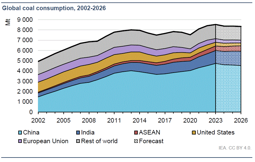 In 2023 China uses more than half of the total coal on the planet — an extraordinary 4.5 billion tons of that 8.5 billion ton total.