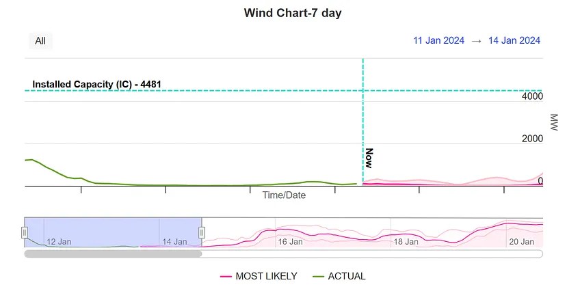 And wind output failed too. On the night of Jan 12-13, during the record-breaking cold temperatures, wind output stood at only 14MWs at 2115hrs. That wasn’t the lowest either. Early in the evening, wind output stood at 8-10MWs. But 8MWs would barely show up on the chart. So, we’re going with output at 2115hrs.