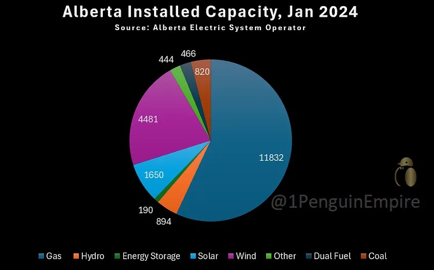For years, the province of Alberta, Canada looked like a decent place to build large scale wind projects. Alberta has wide open, windy spaces. So, in the name of fighting global warming (AKA raking in government subsidies) wind developers built nearly 4,500MWs of wind capacity as of January 2024. Solar’s installed capacity sits at 1650MWs for a combined wind and solar capacity of just over 6100MWs.