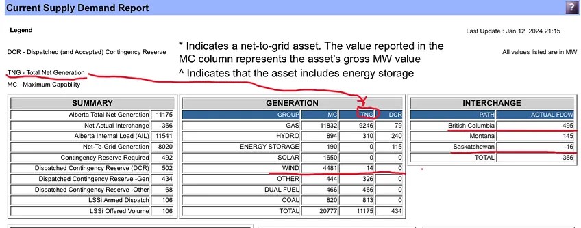 We’ll leave you with this screen shot from the Alberta Electricity System Operator on 1/12/2024 at 2115hrs. (According to power-technology.com, 900MW of gas at Cascade is finalizing construction. It’s backed out for the following calculations.)