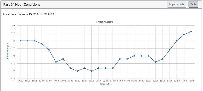 CBC news reported on Friday January 12th that “Just before sunrise in Edmonton, temperatures hit lows of –37C (-34.6F), breaking a daily record of –32 (-25F) set in 1998.”