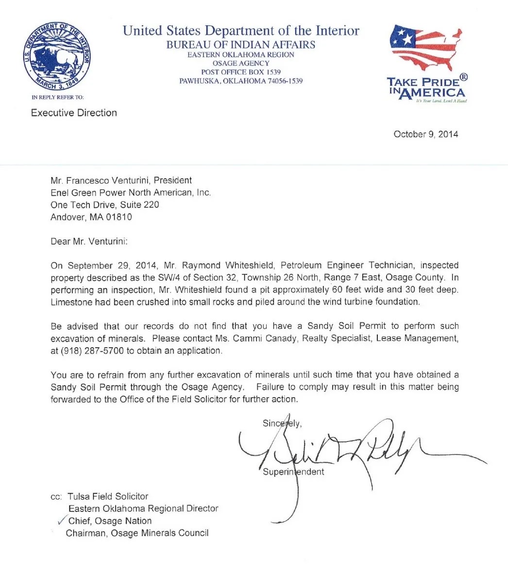 In 2011, according to an article by Benny Polacca of the Osage News, the superintendent of the Bureau of Indian Affairs in Pawhuska wrote a letter to the tribe four days after the Osage County Board of Adjustment approved a variance request for the wind project. The BIA official warned that the project “may have to be removed or relocated” if it interferes with the tribe’s mineral estate. Despite that warning, Enel began building the wind project in 2013. As seen below, on October 9, 2014, the BIA sent a letter to Enel telling it to “refrain from any further excavation of minerals” for the wind project “until such time that you have obtained a Sandy Soil Permit through the Osage Agency. Failure to comply may result in this matter being forwarded to the Office of the Field Solicitor for further action.”